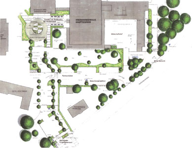 Die Neugestaltung der Außenanlage beinhaltet eine großräumige Neuordnung des Geländes bezüglich der Gesamtfunktion unter Berücksichtigung des Bestandes. Die Erschließung für PKW erfolgt über einen großen Besucherparkplatz, dessen Fahrwege räumlich von den Fußgängerwegen zum Haupteingang getrennt sind, um die Sicherheit der Besucher und Patienten zu gewährleisten. Der Eingangsbereich des Hauptgebäudes ist großzügig als Aufenthalts- und Kommunikationsplatz gestaltet. Die Außenanlage bietet dem Besucher eine positive, anregende und ästhetische Umgebung. Schon beim Blick aus dem Fenster entstehen abwechslungsreiche Blickbeziehungen, die
