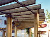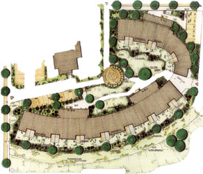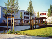 Diese Altenwohnanlage für betreutes Wohnen bietet im ovalen Innenhof einen zentralen Platz mit Pergola. Hier treffen mehrere öffentliche Fußwegeverbindungen zusammen, dadurch entsteht ein Ort der Kommunikation und des Zusammentreffens auch mit anderen Menschen. Die Erdgeschosswohnungen haben nach Süden ausgerichtete, mit einer niedrigen Pflanzung umgebene separate kleine Wohngärten zur individuellen Gestaltung.