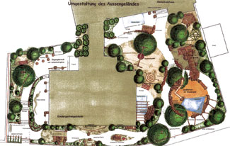 Im ersten Bauabschnitt wird das komplette Außengelände der Kindertagesstätte für die ca. 100 Kinder geöffnet und so bespielbar gemacht. Im Garten, der vorher nur zum Teil aktiv genutzt werden konnte, bieten sich so mehr Rückzugs- und Ausweichmöglichkeiten. Die Ausstattung der Anlage besteht vorwiegend aus natürlichen Materialien, wie Sandsteinfindlinge und Robinienhölzer, die die Kreativität beim Spiel anregen sollen. Die Sandbereichseinfassung und die übrigen Klettermöglichkeiten sind bewusst „lebendig“ ausgebildet, um die Motorik der Kinder zu fördern.